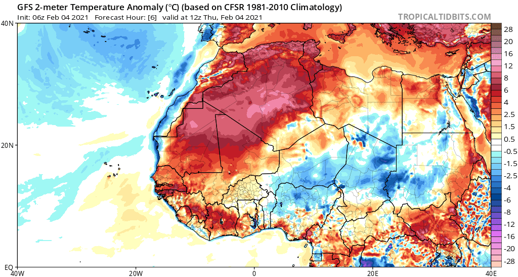 Prévision GFS de l'anomalie des températures sur le nord du continent africain pour le 4 février - Via TROPICALTIDBITS.COM