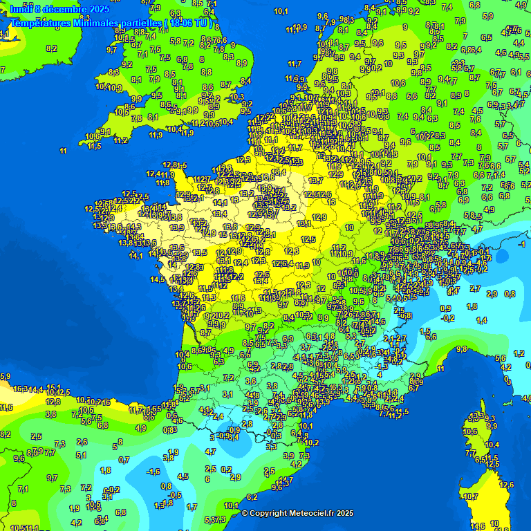 Températures minimales relevées sur la France ce 8 décembre 2025 – via meteociel.fr
