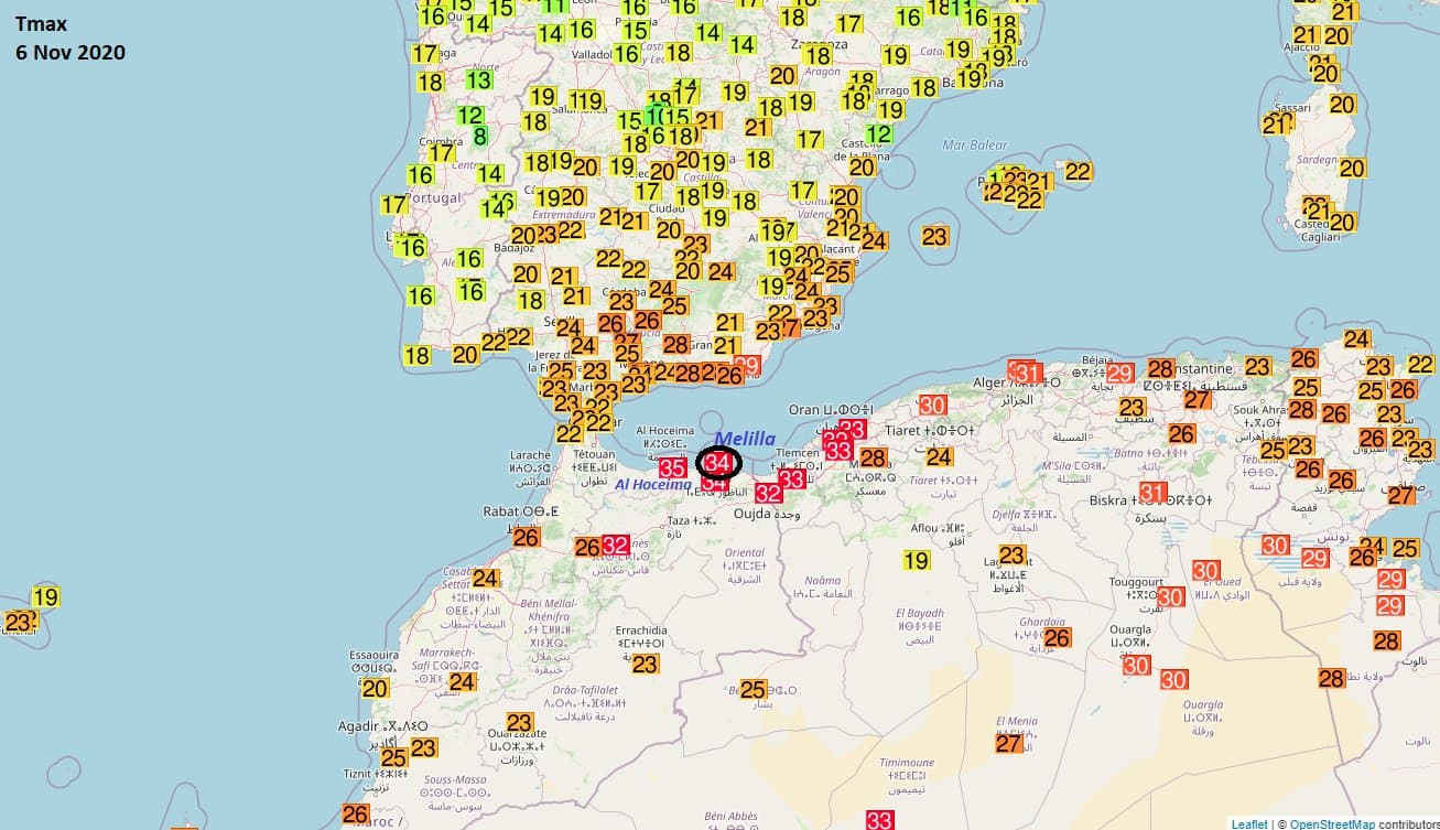 Températures maximales relevés entre le Nord du Maroc et de l'Algérie et le Sud de l'Espagne le 6 Novembre - Via ogimet.com