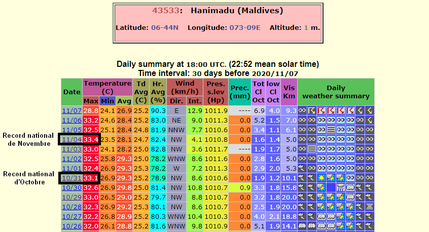 Après un record national déjà battu durant le mois d’Octobre, Haanimadhoo, commune des Maldives a de nouveau battu le record national de chaleur pour un mois de Novembre avec jusqu’à 33.4°C le 04 Novembre dernier (ancien record de 33.1°C le 04/11/2017 à Kadhdhoo). Le record de chaleur mensuel fut également battu sur la capitale de l’archipel avec 32.7°C.