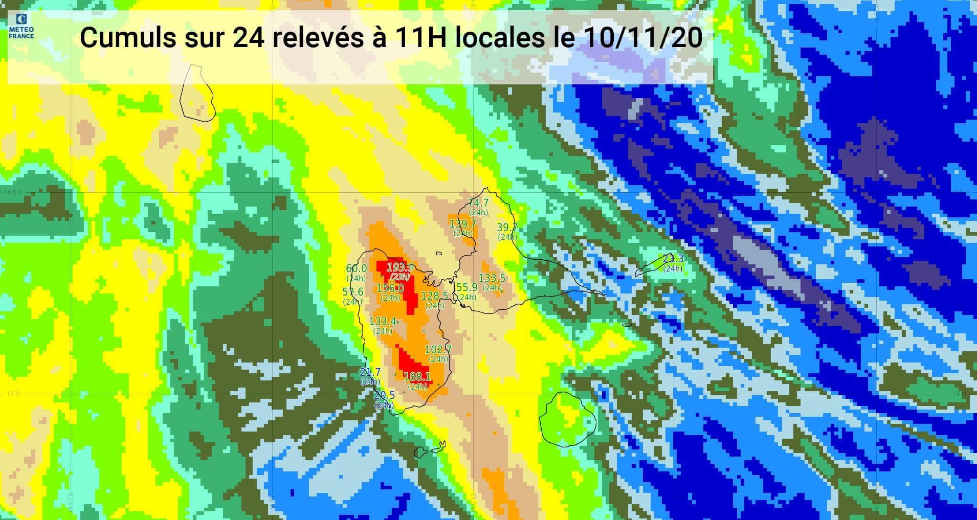 Cumuls relevés sur la Guadeloupe le 10 Novembre dernier - Via Météo-France