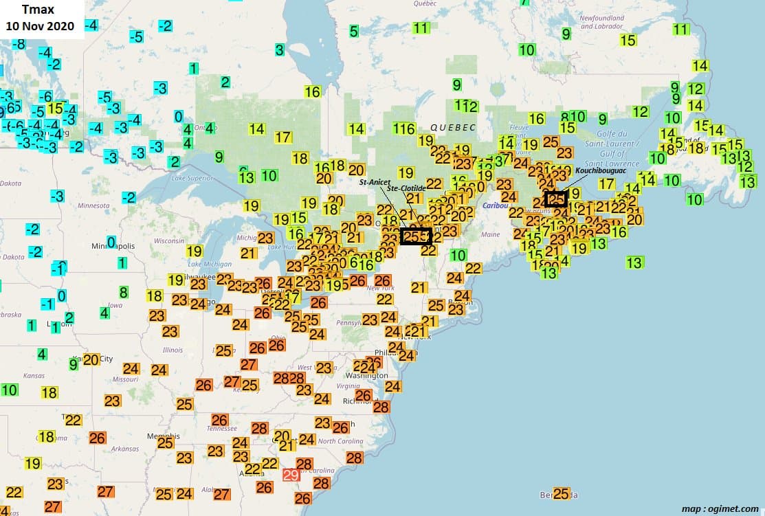Températures maximales relevées le 10 Novembre sur l'Est du Canada - Via ogimet.com