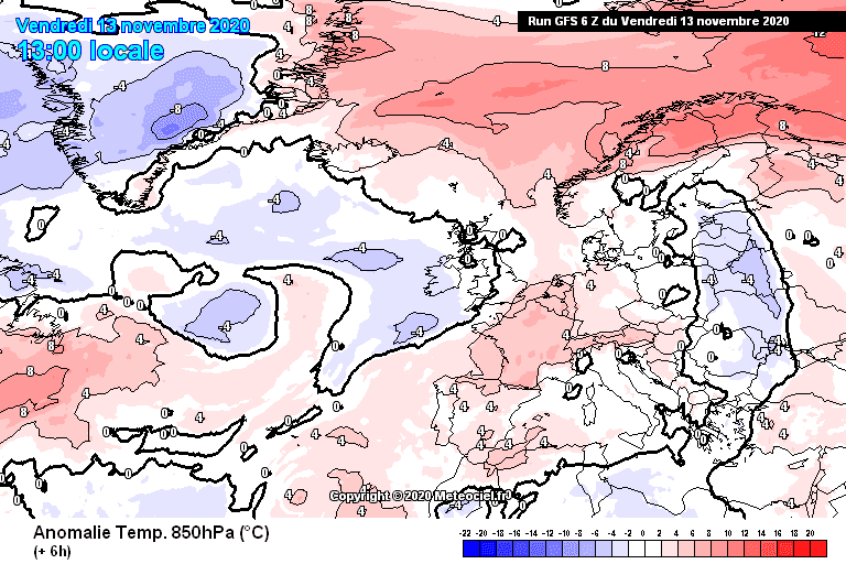 Anomalies de températures à 850 hPa (environ 1200m d'altitude) sur l'Ouest de l'Europe ce Vendredi 13 Novembre - Modèle GFS via météociel.fr