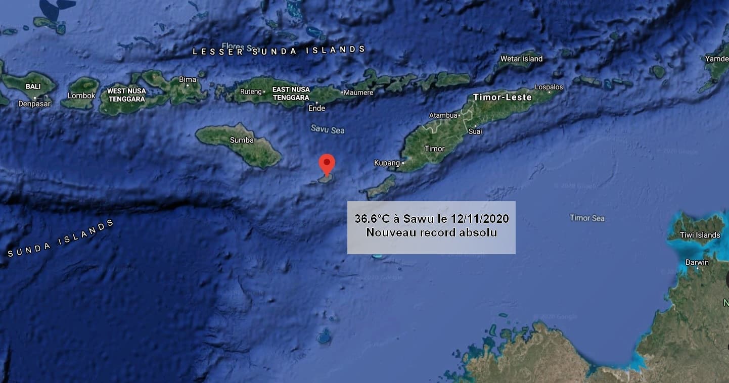 Nouveau record absolu de température maximale sur l'archipel de Sawu ce 12 Novembre - Météo-Villes via Google Earth