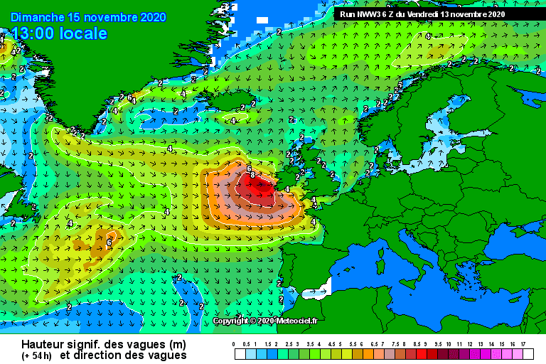 Hauteur maximale de vagues prévue pour le Dimanche 15 Novembre sur l'Ouest de l'Irlande - Modèle NWW via météociel.fr