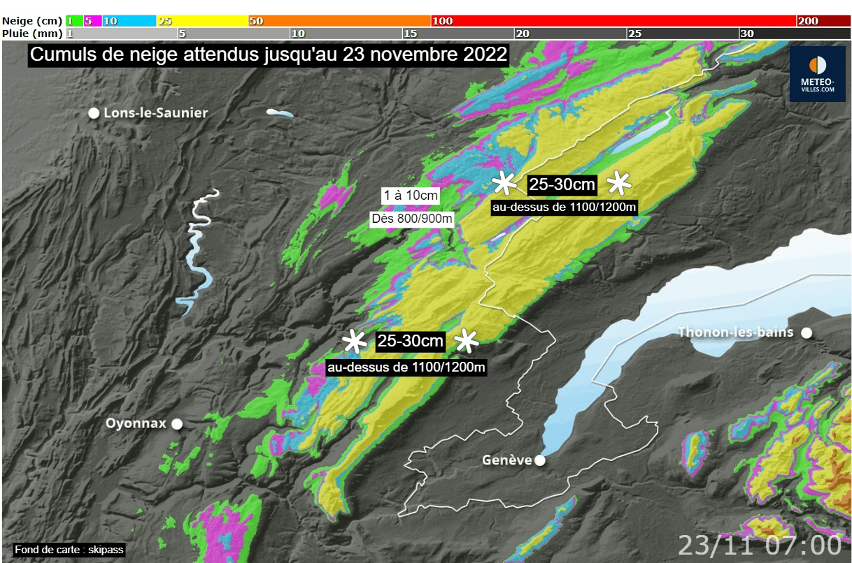 Cette limite pluie-neige devrait fluctuer jusqu'en milieu de semaine prochaine avec des flocons observés sous les 1000m d'altitude durant le week-end et une limite en général située entre 1000 et 1200m au passage de perturbations plus actives entre dimanche soir et mercredi. En conséquence, des cumuls neigeux parfois importants sont attendus sur les plateaux du Jura avec parfois plus de 25-30cm au-dessus de 1100m d'altitude sur ces secteurs, 1 à 10cm entre 800 et 1000m.