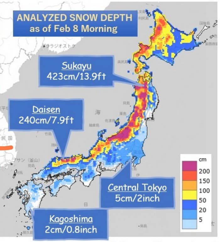 Le 8 février, une grande partie du Japon était ainsi recouverte d'une couche de neige plus ou moins importante avec par exemple 5cm à Tokyo et même 2cm à Kagoshima dans le sud de l'archipel. Les reliefs restent bien sûr les plus fournis en terme d'or blanc avec par exemple 423cm cumulés à Sukayu.