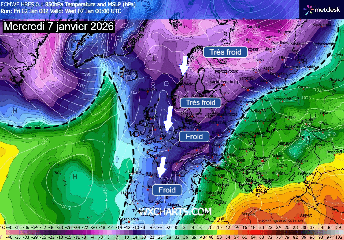 Situation envisagée sur l'Europe en début de semaine du 5 au 11 janvier 2026 – Modèle ECMWF via WX CHARTS