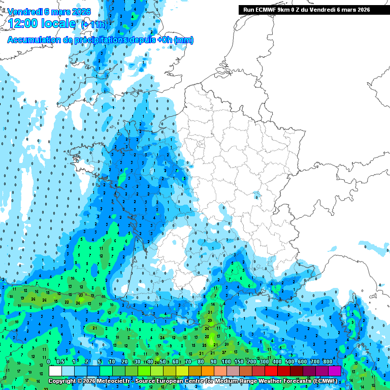 Simulation des cumuls de pluie d'ici la soirée de dimanche - modèle météo européen - Meteociel