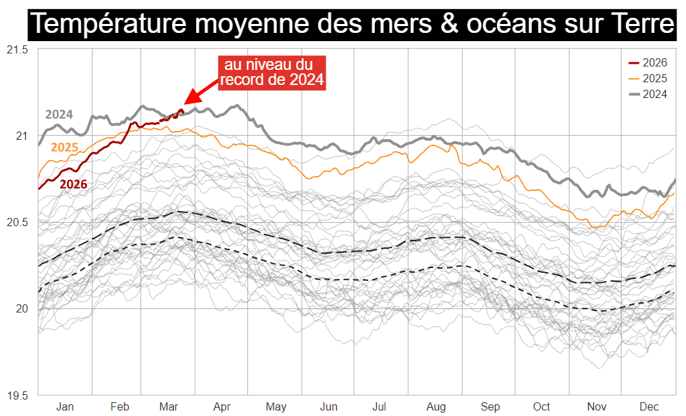 Ces derniers jours, la température moyenne à la surface des mers et océans sur Terre rejoint les niveaux records atteints au cours du début du printemps 2024 ! Selon les données de la NOAA, la température moyenne de l'eau sur notre planète dépasse actuellement les 21°C, très largement au dessus de la moyenne sur la période 1991-2020 et désormais au dessus des niveaux enregistrés l'an dernier à la même époque. Comme le montre le graphique ci-dessous (courbe en rouge foncé), l'anomalie ne cesse de s'amplifier depuis le début de cette année 2026 !