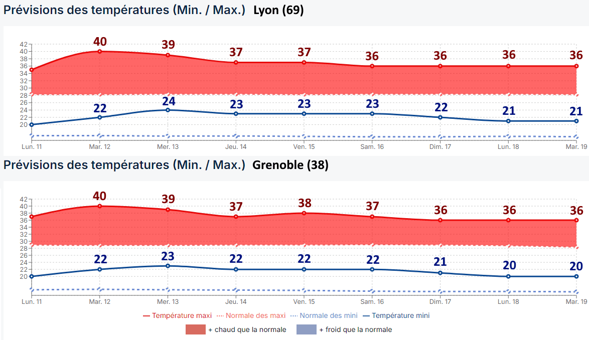 Températures prévues à Lyon et Grenoble jusqu'au mardi 19 août 2025 - Météo Villes