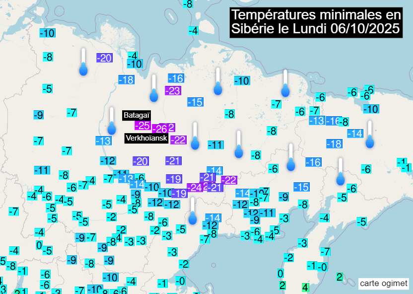 Températures minimales du lundi 6 octobre 2025 en Sibérie - carte ogimet