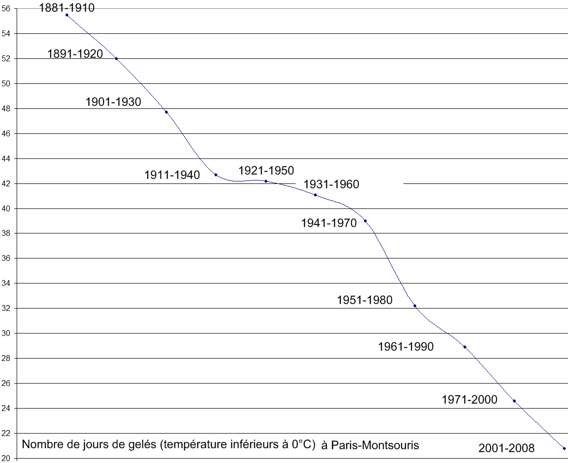 Lorsqu'on additionne l'effet urbain, l'évolution du nombre de jours de gelées chute encore davantage. Voici l'exemple de la station de Paris Montsouris qui est un cas d'école !