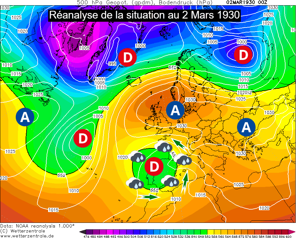 À la fin du mois de février 1930, une dépression atlantique se positionne sur le golfe de Gascogne. Celle-ci se décale vers l'Espagne au début du mois de mars 1930 où elle s'isole en goutte froide, entourée de hautes pressions. Peu mobile, cette anomalie dépressionnaire entretient une météo agitée durant plusieurs jours. Situé au plus près de ces basses pressions, le sud-ouest subit les précipitations les plus importantes. Elles débutent dès le 28 février 1930 et se prolongent jusqu'au 3 mars sans perdre de leur intensité. Pendant quatre jours, des pluies exceptionnelles arrosent le sud-ouest de l'hexagone.