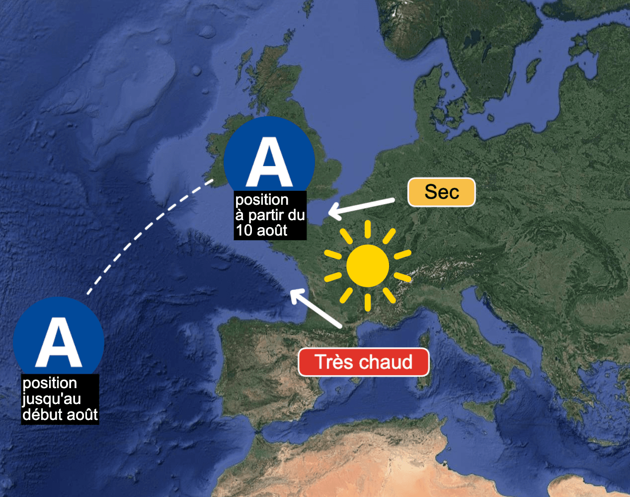 Mais selon les dernières simulations, les hautes pressions (dont notre climat dépend étroitement >>>) vont progressivement remonter vers les îles britanniques dans la semaine du 4 au 10 août, avant de venir se positionner entre les îles britanniques et l’Europe centrale, créant plusieurs appels d'air saharien très chaud.