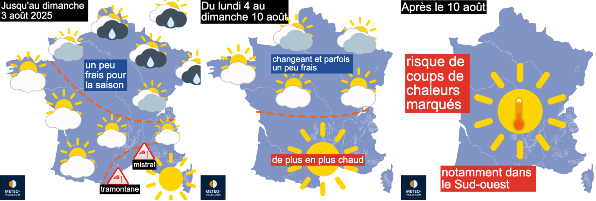 Logiquement, le temps redeviendra plus ensoleillé et plus chaud par le sud-ouest de la France avec déjà de fortes chaleurs sur les régions méridionales avant le week-end des 9 et 10 août.