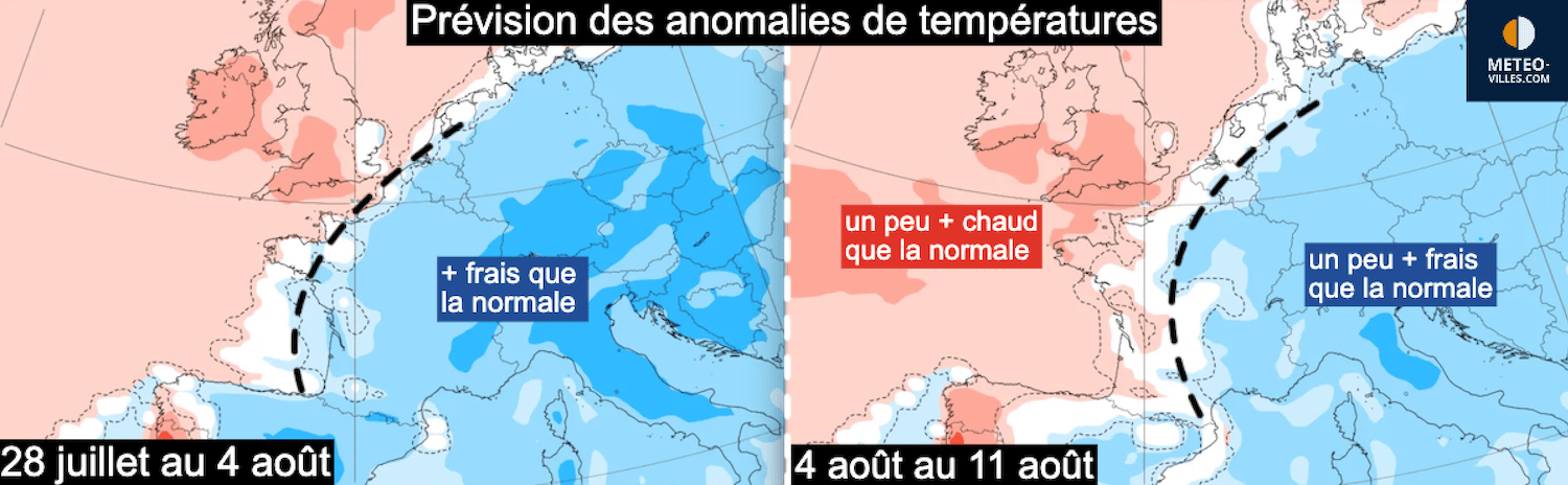 La prévision des anomalies de température entre le 28 juillet et le 11 août confirme ce réchauffement progressif jusqu’à retrouver les normales de saison en moyenne sur la France entre le 4 et le 11 août.