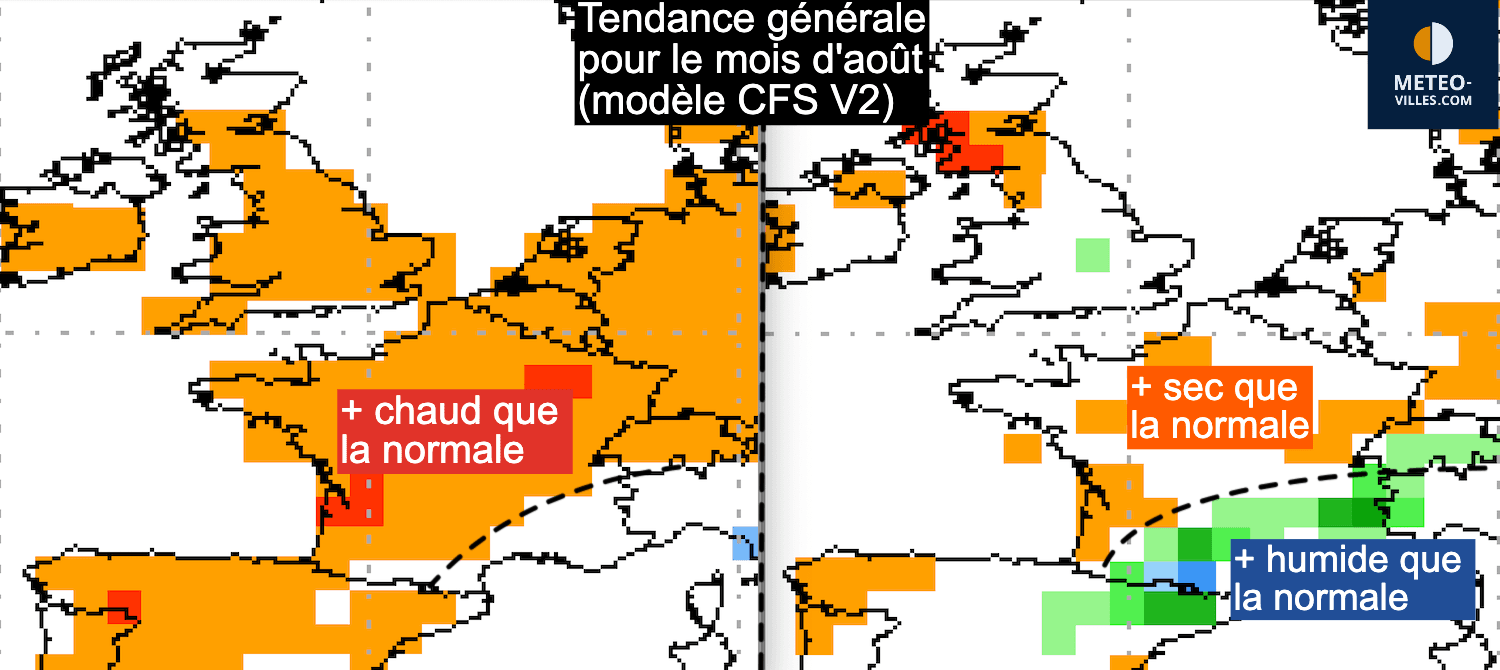 La tendance générale pour le mois d’août indique d’ailleurs une anomalie humide dans les régions méditerranéennes (probablement sous formes de vagues orageuses très ponctuelles) alors qu’ailleurs le mois d’août serait plus sec qu’habituellement.