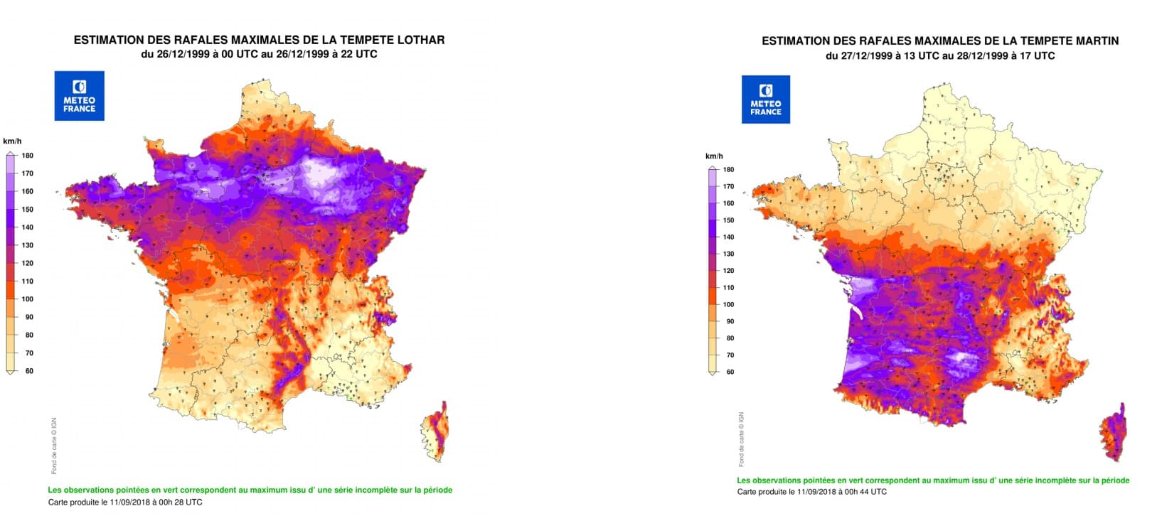 Les tempêtes vont devenir de plus en plus fréquentes dans les prochains mois, celles-ci peuvent atteindre des intensités extrêmes et provoquer des dégâts particulièrement importants et étendus comme ce fut le cas lors des tempêtes Lothar (25-26 décembre 1999) et Martin (27-28 décembre 1999) qui sont les tempêtes de référence en France. Apprenez que le vent avait soufflé jusqu’à 198km/h à Saint-Denis d’Oléron ou encore 173km/h à Saint-Brieux.
