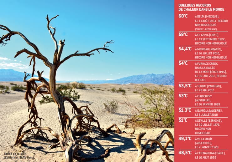 Toutefois, la zone la plus chaude sur la surface du globe est la bien nommée "vallée de la mort" aux États-Unis. Située dans une zone désertique de Californie, cette région est habituée aux températures extrêmes. Lors de l'été 2020, le record mondial de chaleur y a été battu avec une valeur maximale de 54,4°C à Furnace Creek le 16 août ! Une autre valeur de 56,7°C y avait été mesurée en juillet 1913 mais la station souffrait d'une probable surchauffe et cette valeur n'est pas homologuée.