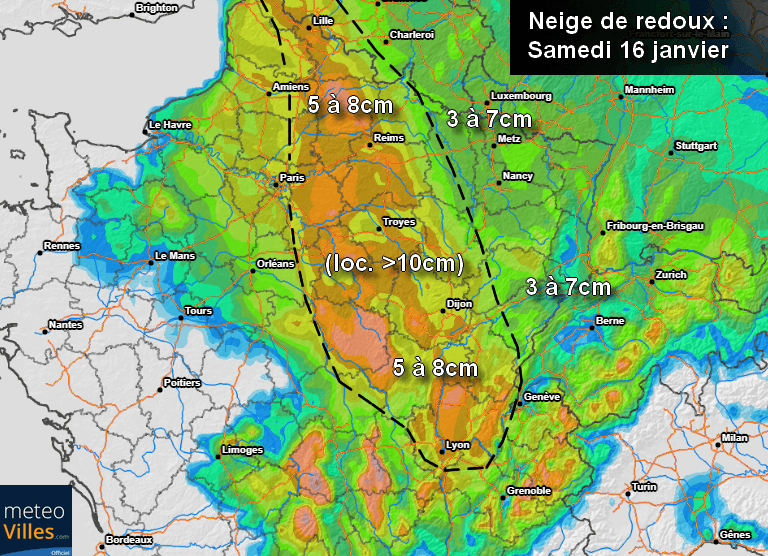 C'est entre l'intérieur du Nord et les abords du Jura que les quantités les plus importantes sont attendues avec entre 5 et 8cm en général sur ces secteurs, parfois plus de 10cm selon les zones. On attend entre 1 et 3cm jusqu'à Lyon et Genève, entre 3 et 7cm à Metz ou Nancy et parfois plus de 10cm près de Besançon.