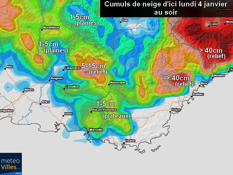C’est entre les Alpes-Maritimes et l’Est des Alpes-de-Haute-Provence que la neige devrait être la plus abondante avec entre 20 et 50cm supplémentaires en 72h dès 800-1000m d’altitude. Les cumuls neigeux pourraient bien dépasser 1 mètre sur cet épisode, plus de 60cm ont en effet déjà été relevés depuis ce vendredi 1er janvier dans l’arrière-pays azuréen.