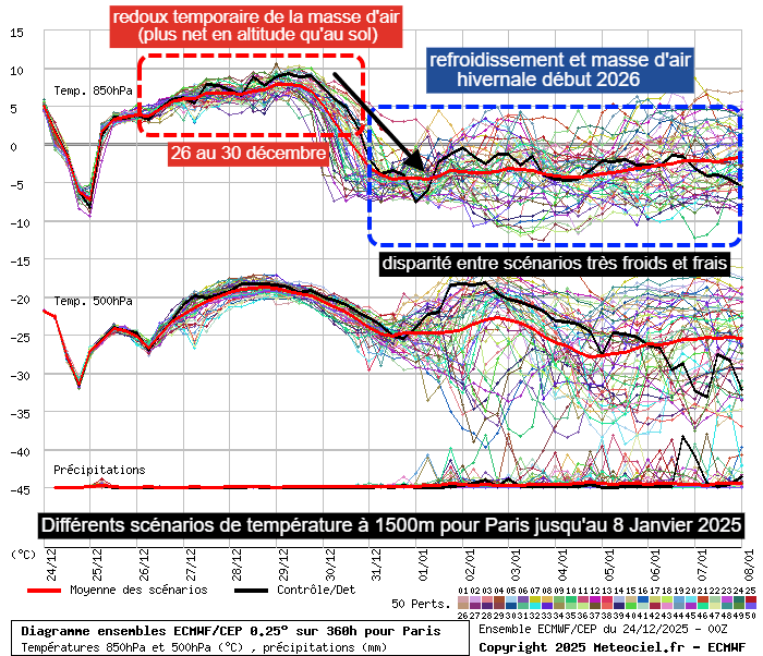 Après le coup de froid de Noël, la masse d'air va se radoucir quelques jours. Ce redoux sera plus net dans le sud de la France car au nord, le froid dominera encore dans les basses couches. Ensuite, la quasi-totalité des scénarios envisagent un nouveau refroidissement aux alentours du passage à la nouvelle année. Pour le début 2026, la plupart des scénarios sont froids même s'il existe des disparités assez nets entre des scénarios très froids (proches de -10°C à 1500m d'altitude à Paris) et des scénarios simplement frais (légèrement au dessus du 0°C à 1500m).
