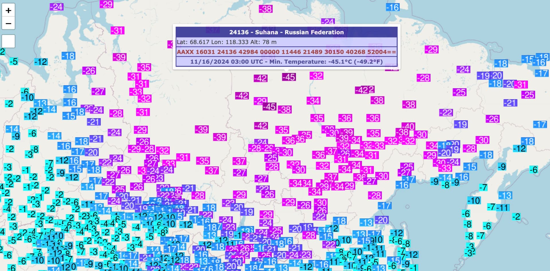 Le 17 novembre dernier, les températures sont parfois descendues sous les -40/-45°C sur les secteurs les plus froids du Nord-Est de la Russie. On a par exemple pu relever jusqu'à -45,9°C à Sukhana, la température la plus basse de la saison froide relevée dans l'hémisphère Nord pour le moment.