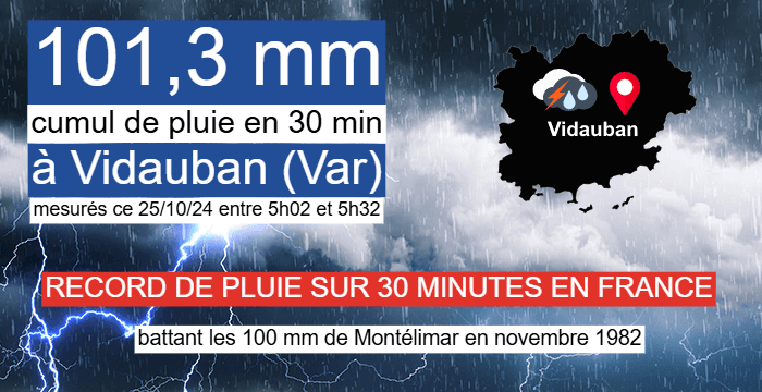 L'orage diluvien qui s'est abattu sur Vidauban a atteint son pic d'intensité vers 5 heures du matin. Entre 5h02 et 5h32 ce 25 octobre 2024, la station Météo France a enregistré un cumul de 101,3 mm ! Preuve du caractère historique de ces pluies, il s'agit tout simplement d'un record absolu de pluie sur 30 minutes en France métropolitaine ! L'ancien record de pluie en une demi-heure était détenu par Montélimar avec 100 mm tombés en 30 minutes en novembre 1982.