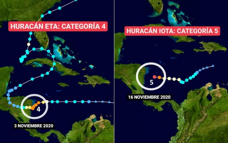 De plus, ces deux phénomènes majeurs ont frappé la même zone géographique. Il y a 2 semaines, l'ouragan Eta frappait le Nicaragua en catégorie 4 tandis que l'ouragan Iota frappe ce mardi 17 novembre le même pays en catégorie 5 ! Le sort s'acharne sur cette région du globe qui n'avait pas encore pansé ses plaies après le passage d'Eta.