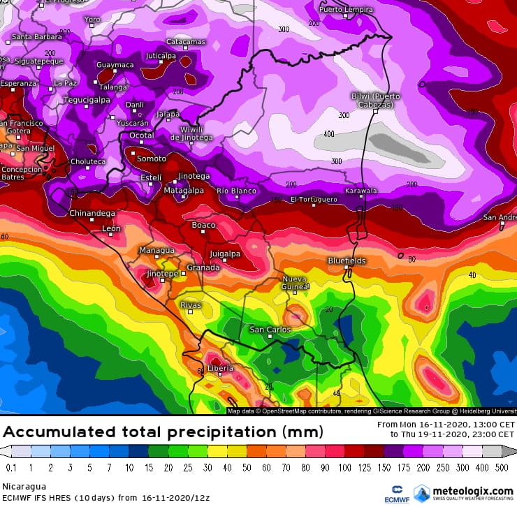 Outre les vents violents, la pluie représente une menace majeure pour une large moitié nord du Nicaragua et pour l'est du Honduras. Des pluies diluviennes sont en cours et les cumuls en l'espace de 48 à 72 heures s'attendent à des accumulations pouvant atteindre 200 à 400 mm ! Avec des sols saturés en eau après le passage des pluies diluviennes de l'ouragan Eta il y a 2 semaines, on craint des inondations majeures dans les toutes prochaines heures.