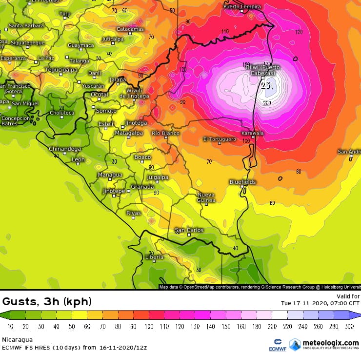Modélisation des rafales maximales au Nicaragua dans la nuit du 16 au 17 novembre 2020 - via meteorologix