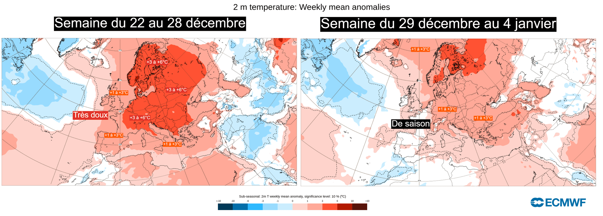 Évolution des anomalies de températures entre le 15 et le 28 décembre 2025 – ECMWF