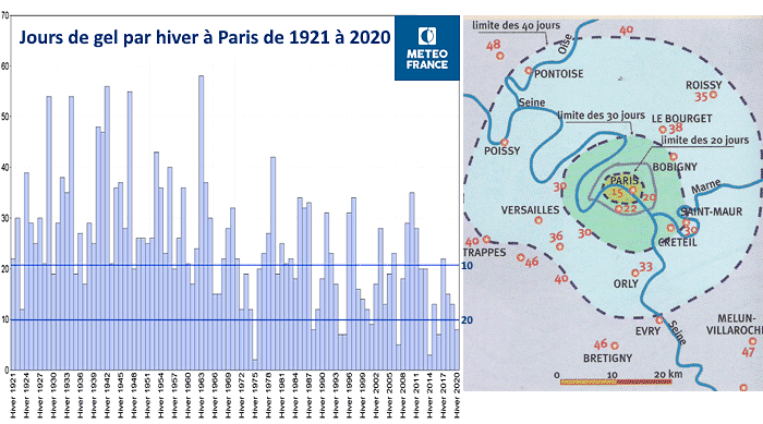 Ce constat est encore plus marquant dans les grandes villes, où l'urbanisation grandissante des dernières décennies n'a fait qu'amplifier l'îlot de chaleur urbain. Le graphique ci-dessous montre une baisse impressionnante du nombre de jours de gel à Paris-Montsouris en hiver. Depuis les années 1990, la majorité des hivers enregistrent moins de 20 jours avec gel et il n'est désormais plus rare de vivre des hivers avec moins de 10 jours de gel à Paris. En plus du réchauffement global, l'îlot de chaleur vient inévitablement accentuer cette tendance. En sortant de Paris, le nombre de jours de gel double rapidement puis triple en dehors de la petite couronne.