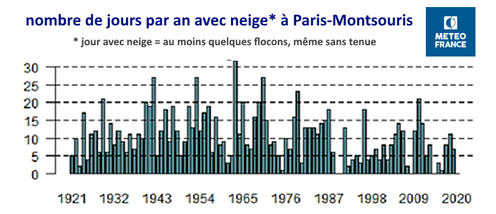 Avec moins de froid, il est logique qu'il y ait aussi moins de neige en plaine. Paris est particulièrement concernée. Le graphique ci-dessous montre que l'accentuation de la baisse du nombre de jours de neige (au moins quelques flocons) par an s'est accentuée depuis les années 1990, comme pour la baisse du nombre de jours de gel. Depuis 30 ans, les premières années sans le moindre flocon à Paris sont apparues. Il devient rare d'observer une année à plus de 10 jours de neige dans la capitale, et les jours avec neige tenant au sol se réduise à peau de chagrin.