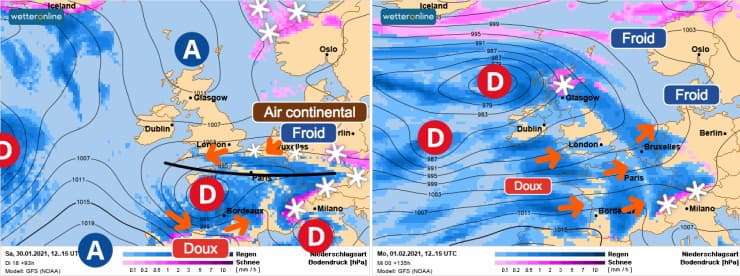 Un conflit de masse d'air s'observe actuellement sur l'ouest de l'Europe. Si l'air doux venu de l'océan est en train de prendre l'avantage, l'air froid reste proche sur le centre et le nord du continent, campant sur le nord de l'Allemagne et des Pays-Bas. Ce samedi 30 janvier 2021, une dépression circulera sur la France et viendra rabattre l'air froid sur le nord de notre pays en journée du dimanche 31 janvier.