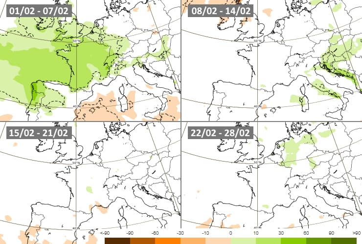 Côté précipitations, le modèle européen associe un temps perturbé et copieusement arrosé à la douceur du début février. En revanche, il n'y a pas plus d'anomalies pluviométriques que d'anomalies thermiques se dégageant pour les trois semaines suivantes. Le modèle propose ainsi un scénario dans les normales sur l'ensemble de la France.