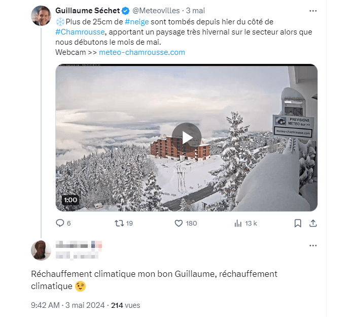 Entre la mi-avril et le début de ce mois de mai 2024, les conditions météorologiques souvent très fraîches et humides ont réveillé les climato-sceptiques. Nous avons reçu des commentaires ironisant sur le réchauffement climatique sous de nombreuses publications évoquant la fraîcheur, la pluie ou la neige en montagne. Certains commentaires sont simplement moqueurs quand d'autres sont plus virulents. Dans les faits, nous sommes habitués à lire ces réactions dès que les températures passent en dessous des normales de saison.