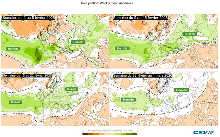 Anomalies de précipitations hebdomadaires sur l'Europe en février 2026 – ECMWF