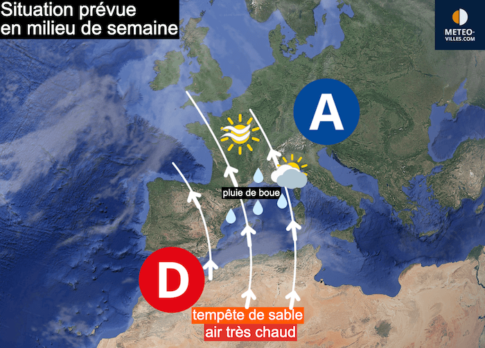 Schéma d'explication des remontées massives de sable du Sahara pour cette semaine - meteo-villes.com