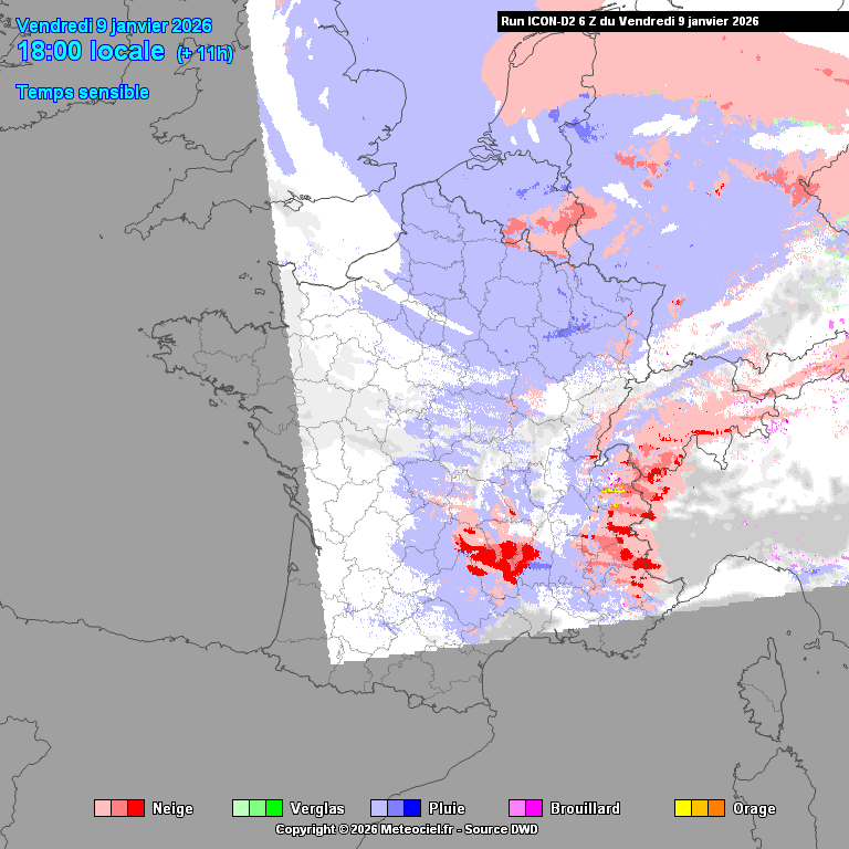 Animation du type de précipitations sur l'est de la France du 9 au 11 janvier 2026 – Modèle Icon-d2 via meteociel.fr