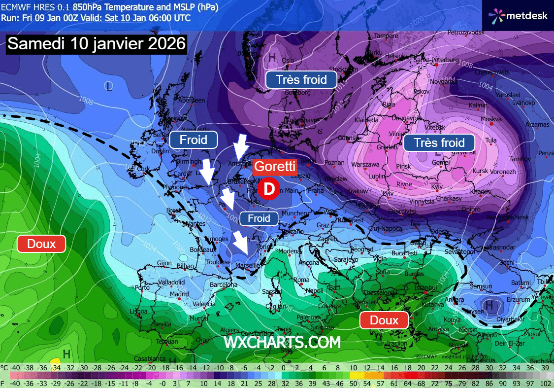 Situation du samedi 10 janvier 2026 – Modèle ECMWF HRES via WX CHARTS