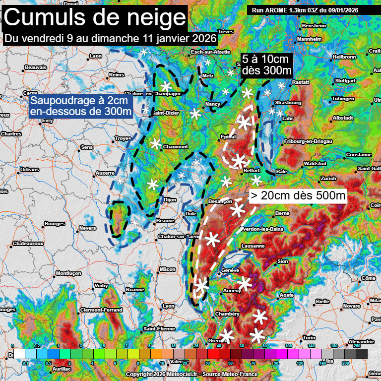 Cumuls de neige attendus jusqu'au dimanche 11 janvier 2026 sur le nord-est de la France – Modèle arome via meteociel.fr