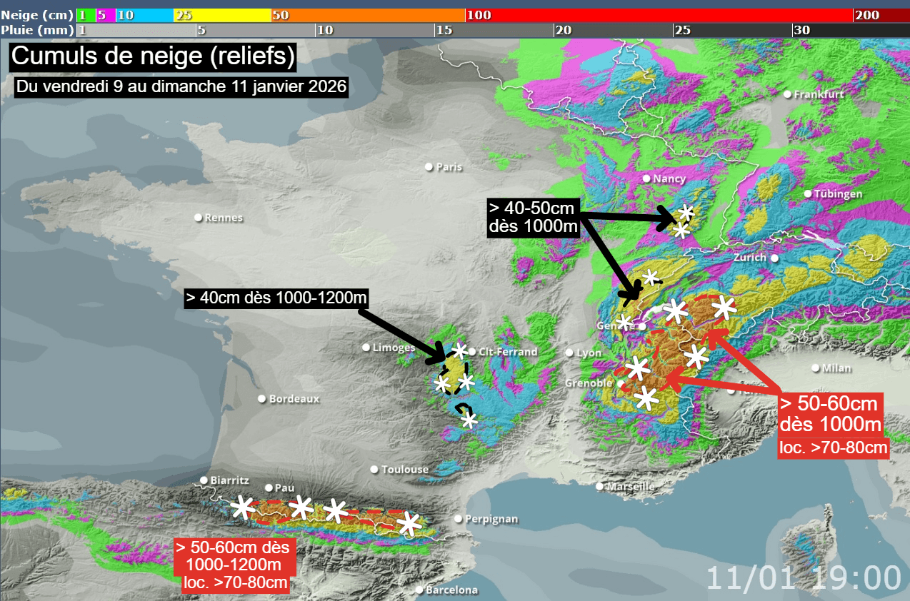 Cumuls de neige attendus sur les reliefs français d'ici dimanche 11 janvier 2026 - Via Skipass