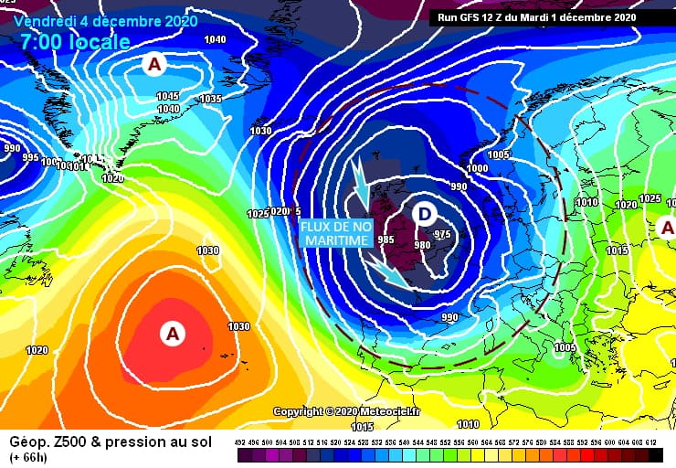 Après une première partie de semaine mitigée, nous allons assister à la plongée d'une dépression depuis la Mer de Norvège vers la France au cours des journées du jeudi 3 et du vendredi 4 décembre 2020. Ce vaste système dépressionnaire apportera avec lui un flux de nord-ouest maritime responsable d'un froid modéré.