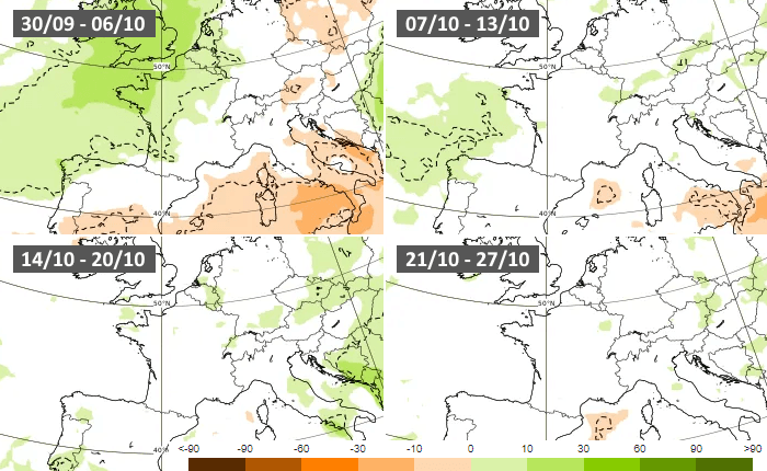 Anomalies pluviométriques hebdomadaires en octobre 2024 selon le modèle européen - ECMWF