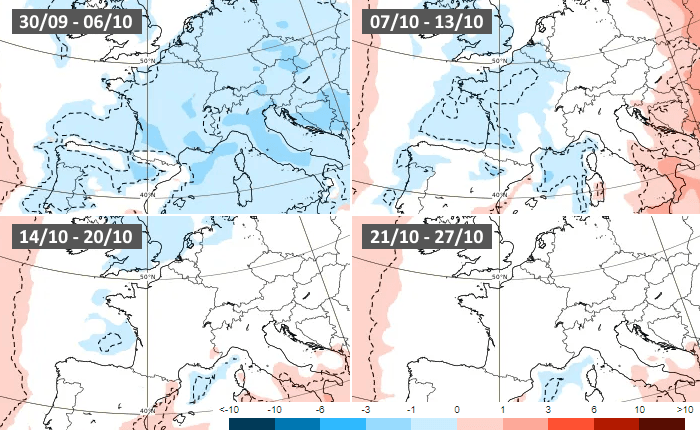 Anomalies thermiques hebdomadaires en octobre 2024 selon le modèle européen - ECMWF