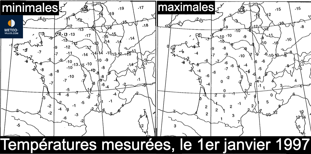 Températures extrêmes mesurées durant la journée du 1er janvier 1997 (l'une des plus froides jamais enregistrées pour un jour de l'an)