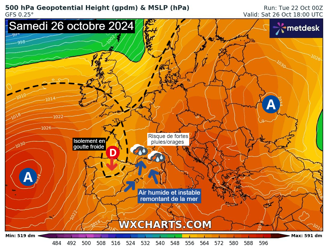 Ce thalweg devrait en effet rapidement évoluer en « cut-off » (ou goutte froide) d'ici le week-end, s'isolant entre les hautes-pressions et apportant de ce fait une situation à nouveau favorable à de fortes précipitations parfois orageuses entre les abords des Cévennes et la Méditerranée.