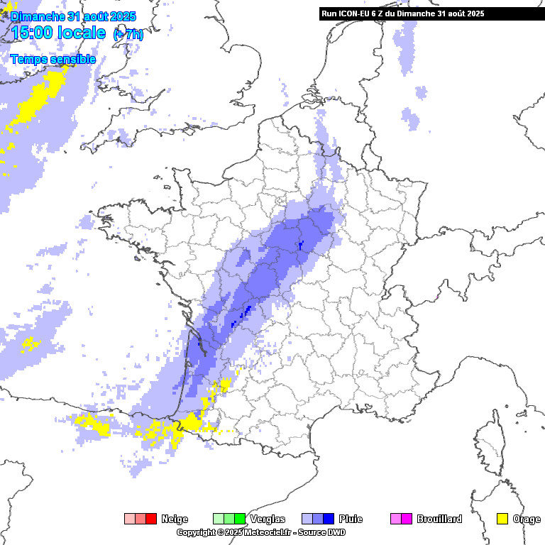 Évolution des précipitations entre dimanche 15 h et lundi 22 h. Les orages apparaissent en jaune sur cette animation - modèle Météo allemand icône